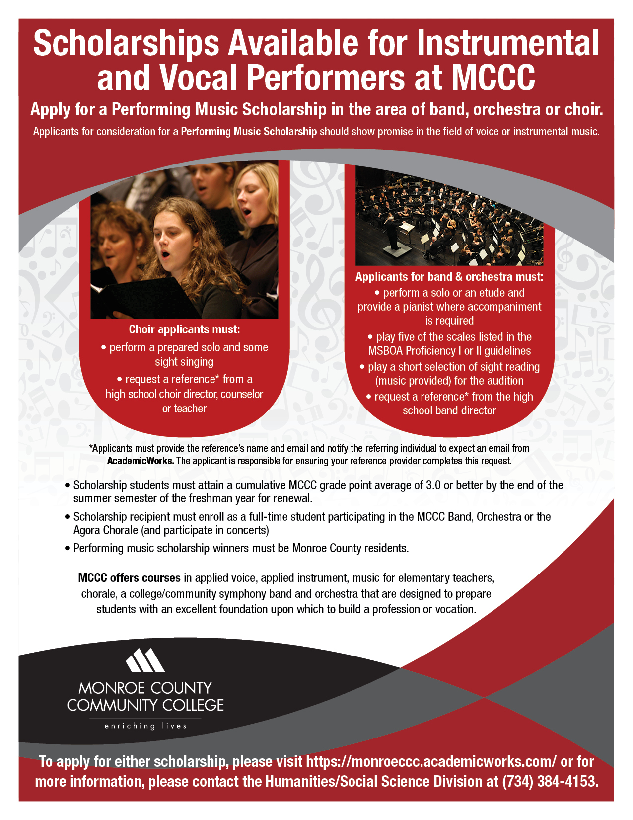 Eligibility: Monroe County resident, full-time student, participating in the MCCC Band, MCCC Agora Chorale, or MCCC Orchestra audition required